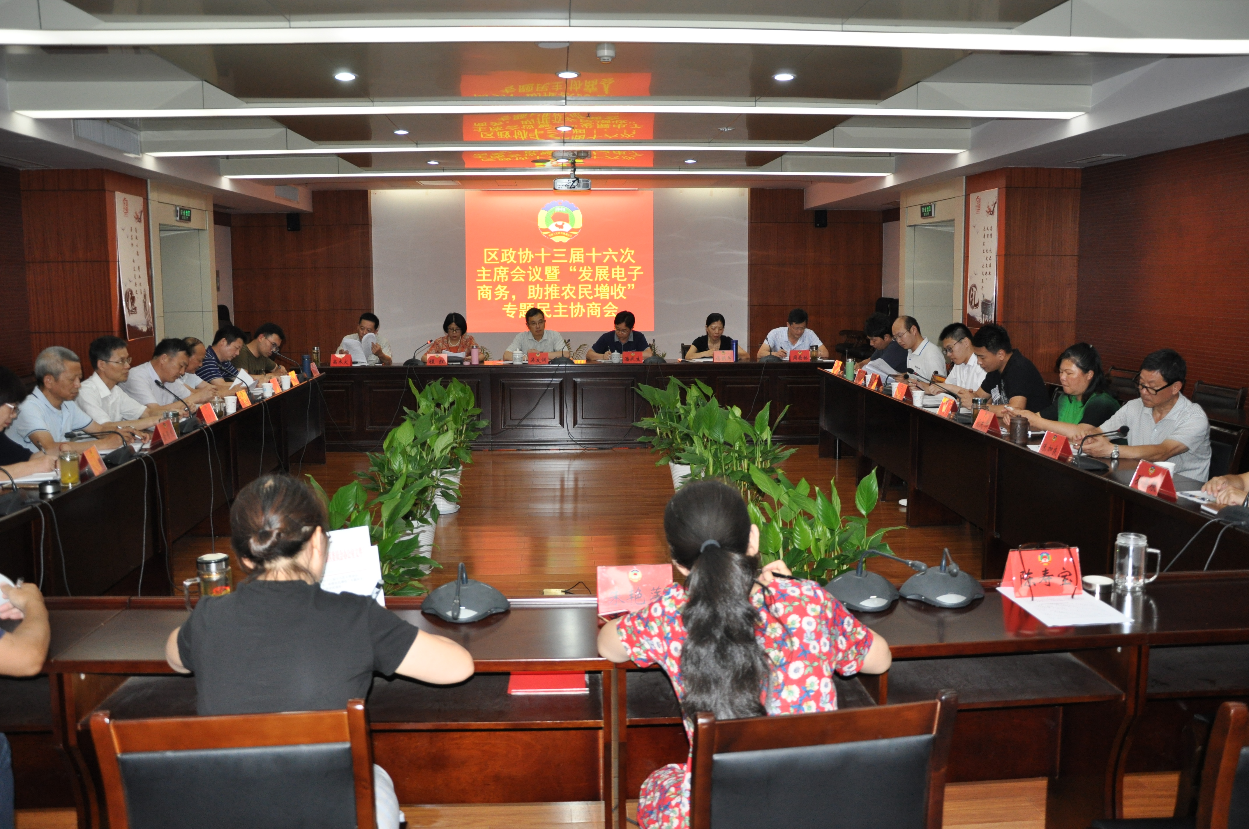 6 月27日,区政协召开十三届十六次主席会议暨“发展电子商务,助推农民增收”专题民主协商会。区政协主席吴友训、副主席程红、傅颖兵、高木火、周西林出席会议,副区长潘武生应邀参加会议。会议由程红主持。